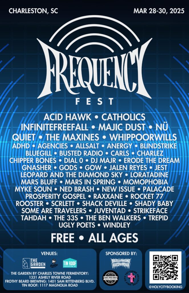 Inspired by the legendary 96 Wave Fest of the ’90s, the event will showcase over 50 artists across a wide spectrum of genres, including rock, hip-hop, folk, punk, and more. Hosted by Holy City Booking, Frequency Fest is a grassroots effort focused on uplifting the local and regional music scene in Charleston and beyond.