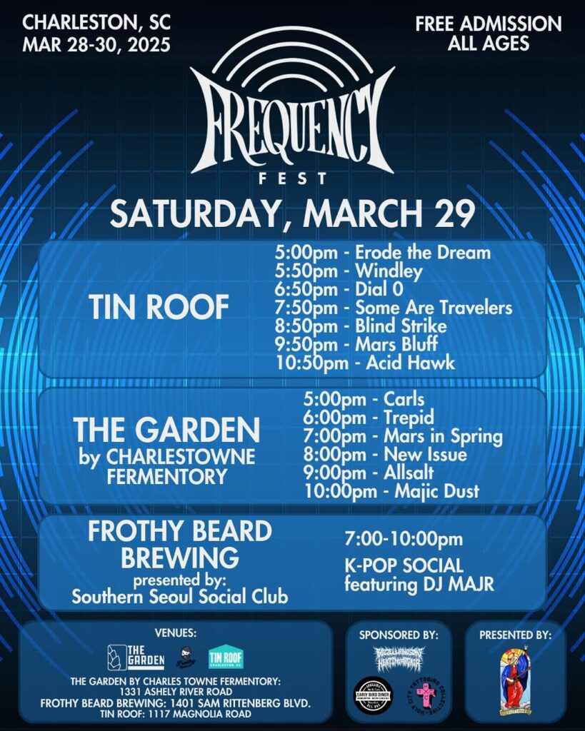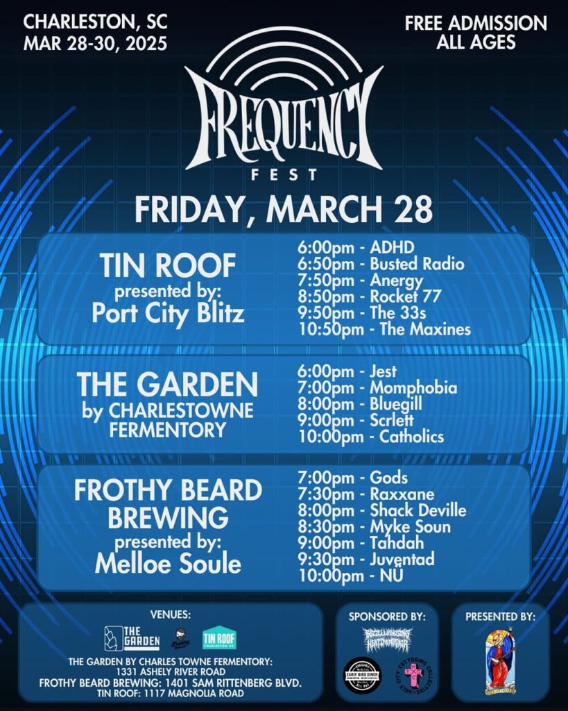 Frequency Fest is a free, all-ages music festival happening in Charleston from March 28-30, spanning three West Ashley venues: Tin Roof, The Garden at Charles Towne Fermentory, and Frothy Beard Brewing.