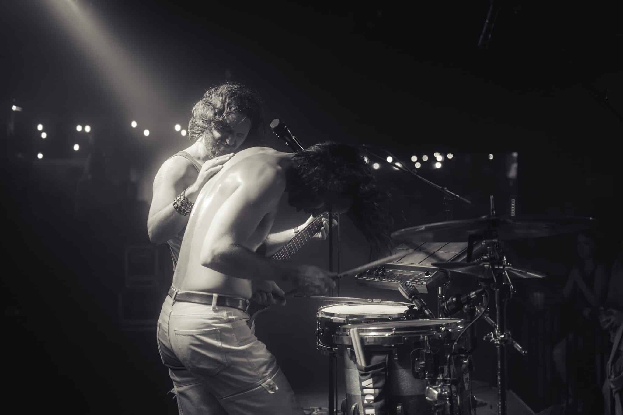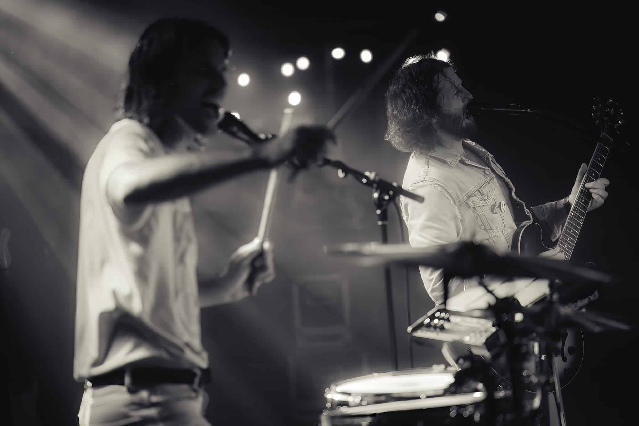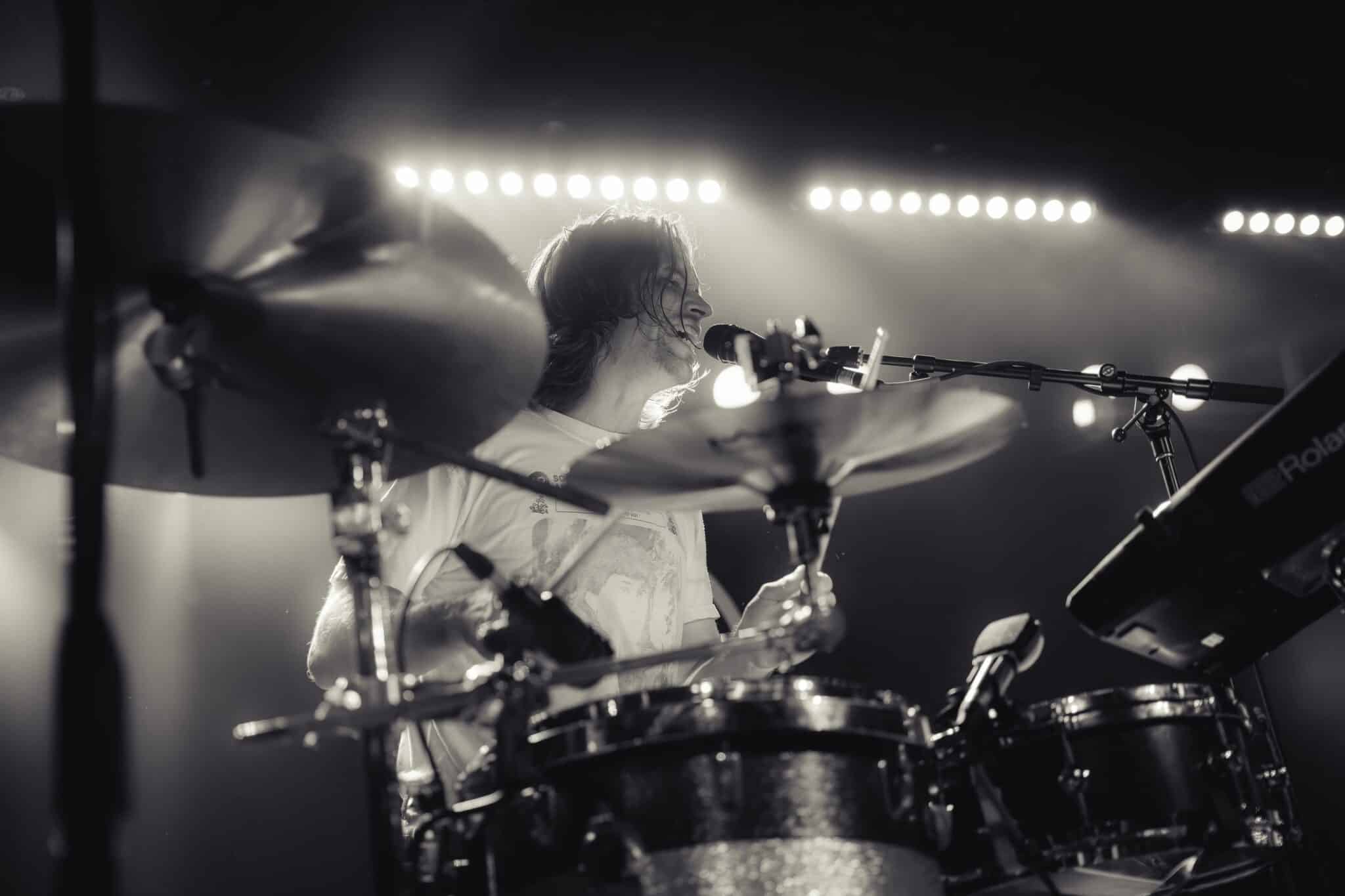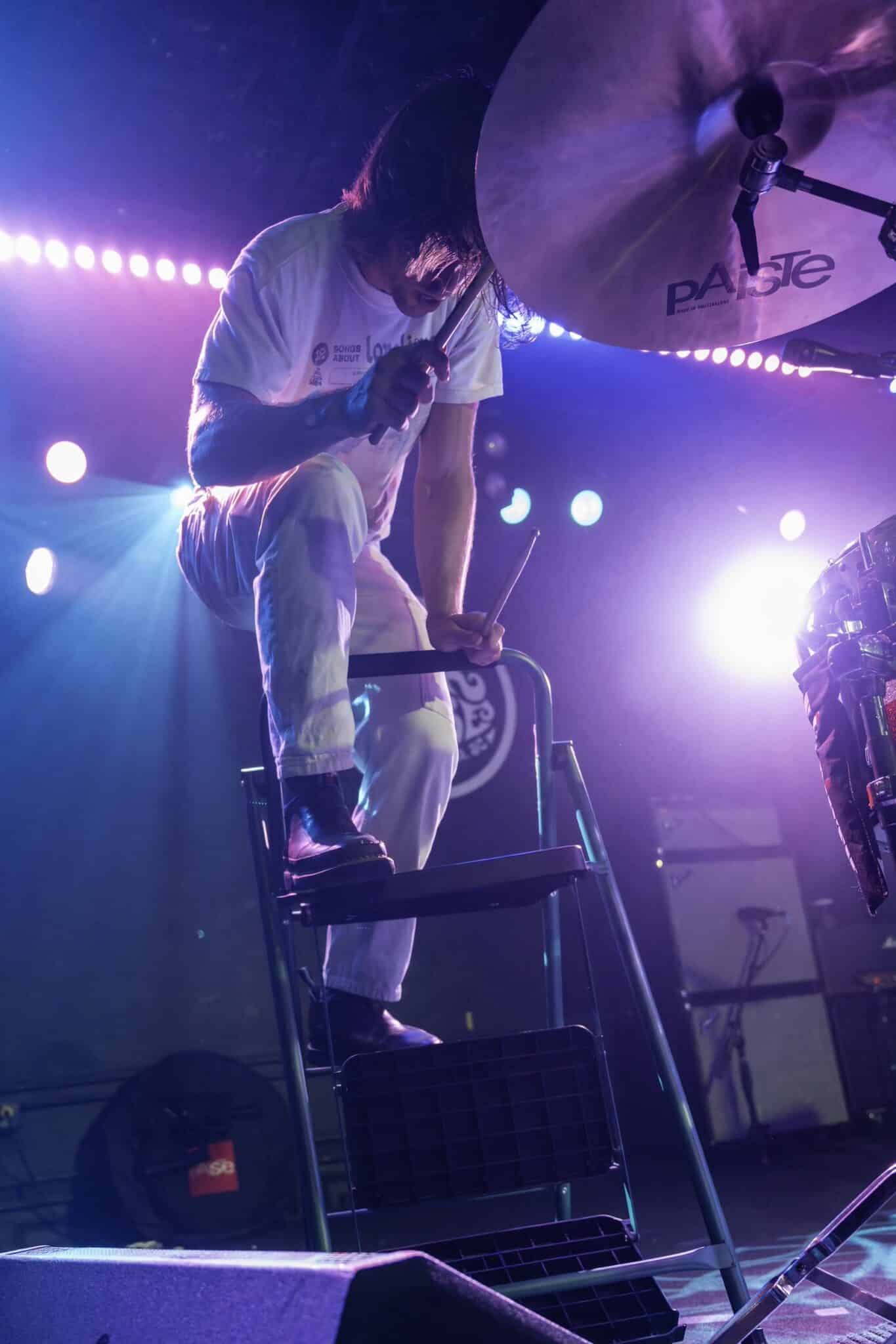 Both members bring an engaging presence, but Jake as the drummer was especially fun to watch this night. Standing up drumming is an athletic feat and he takes full advantage of the mobility. Right away he pulled the ride cymbal off his kit and started to run around the stage with it. Some drummers worry when they’re short a wing nut — Jake doesn’t even use them. Three songs in, he’s leaping off a step stool into the hands of the crowd.