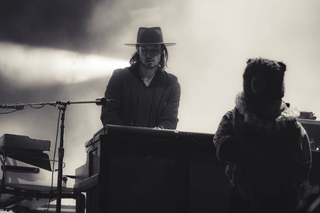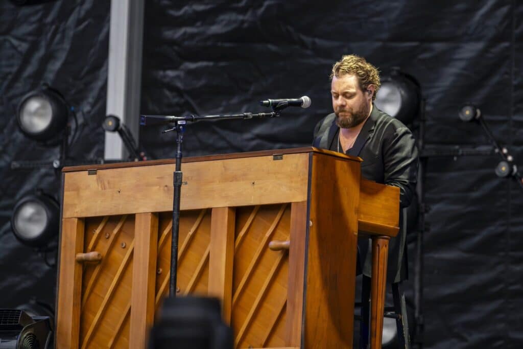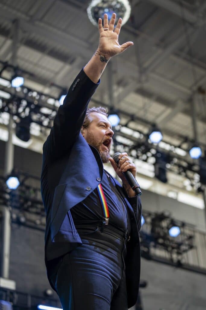 Rateliff took the stage and sat down at his piano, and the band followed suit into “David & Goliath,” the opening track to their latest album, South of Here (2024). Soon, he was out from behind the piano, revealing an all-black outfit with a touch of rainbow suspenders. The group took the Thursday night crowd to church, as they stomped and clapped along like a Southern congregation.