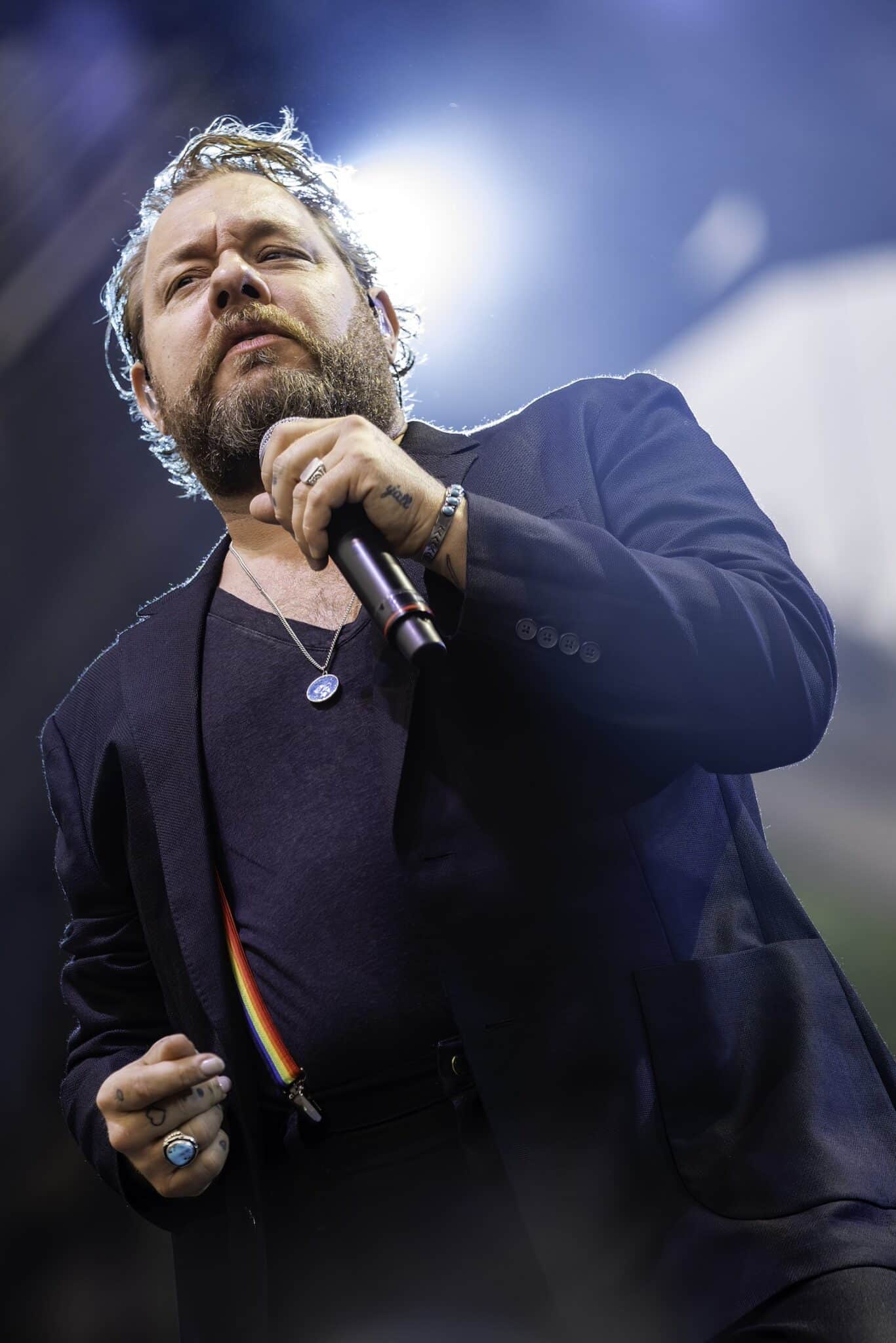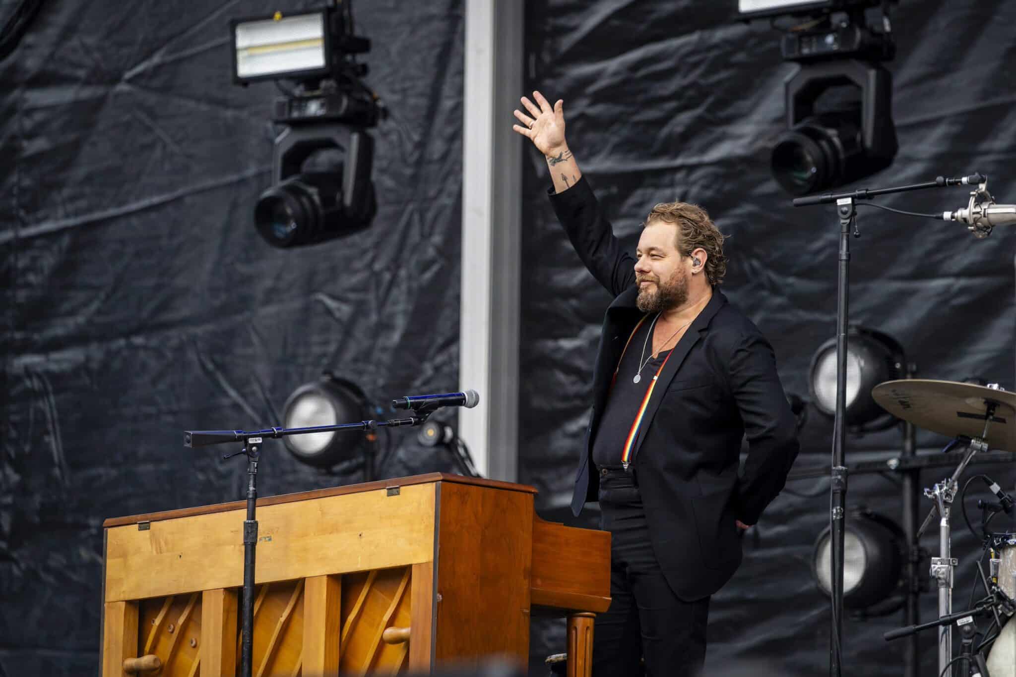 Rateliff took the stage and sat down at his piano, and the band followed suit into “David & Goliath,” the opening track to their latest album, South of Here (2024). Soon, he was out from behind the piano, revealing an all-black outfit with a touch of rainbow suspenders. The group took the Thursday night crowd to church, as they stomped and clapped along like a Southern congregation.