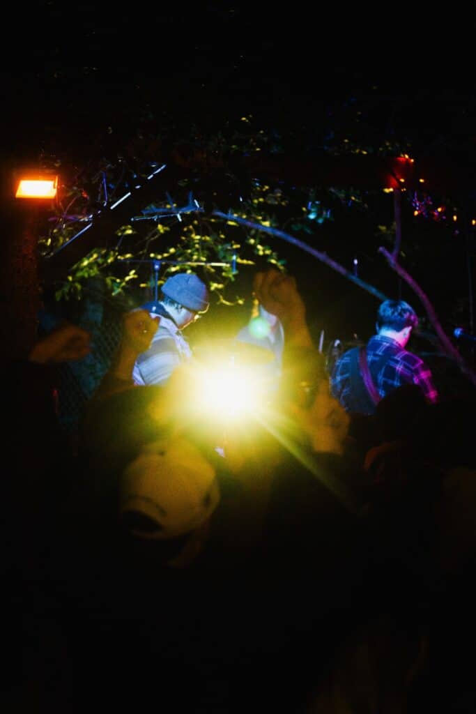 We saw around ten dudes setting up a tarp behind this giant elevated stage with light racks nestled against the street. We gave each other the ‘holy shit’ look as this setup combined two houses, likely bringing the total capacity over 900.