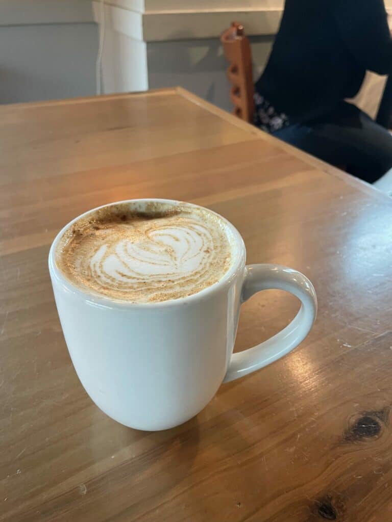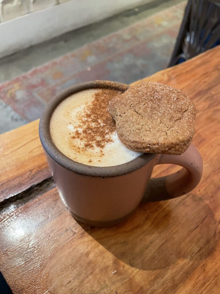 “[The Harbinger] make[s] all of their syrups and flavors in house. Some of their lattes come with cookies. I got a pumpkin spice latte (it’s the season for it). It comes with a pumpkin shaped cookie! Which isn’t even my favorite part,” she said. “Their take on a pumpkin spice latte doesn’t taste like a candle, they actually have bits of ginger and cinnamon you see that is left over in the bottom of the mug.”